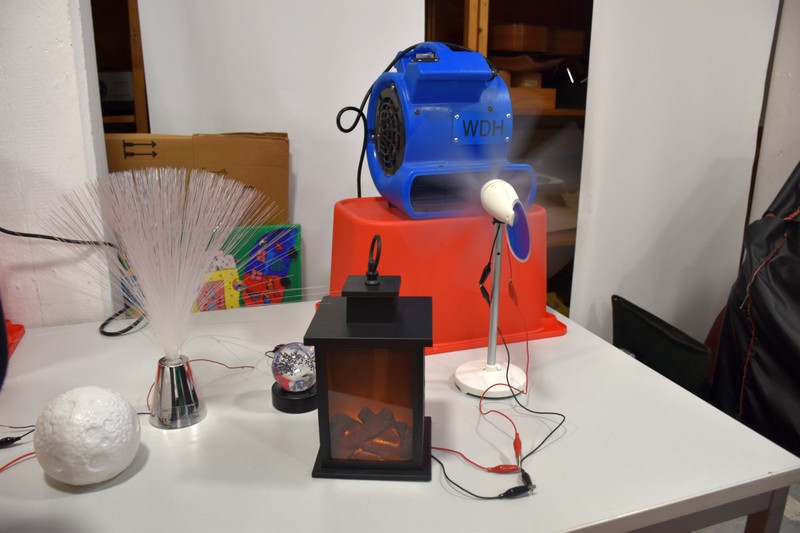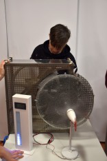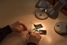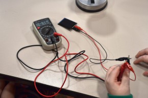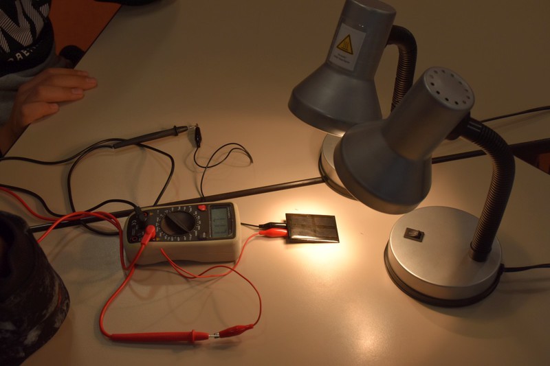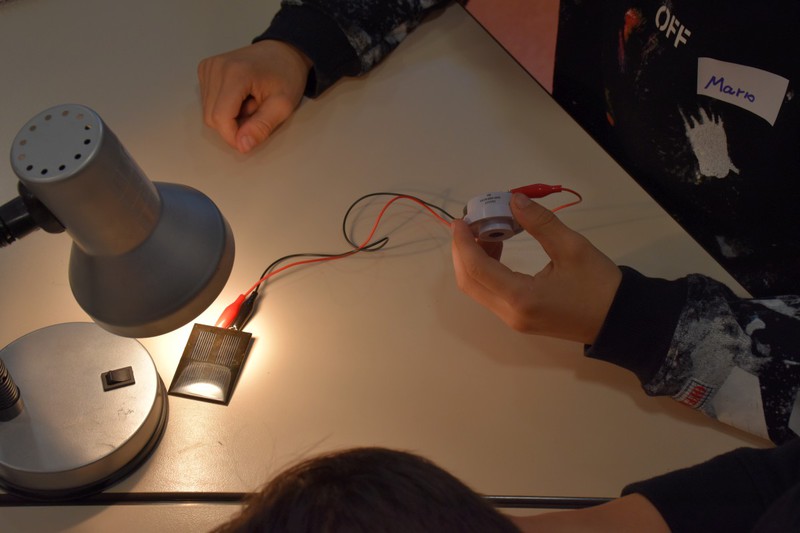 Auf jedem Tisch befand sich eine Lampe, zusätzlich bekam jeder Gruppentisch eine kleine Solarzelle und ein Überbrückungskabel (schwarz und rot). Die Lampe am Tisch versorgte die Solarzelle mit dem benötigten Licht, um Strom erzeugen zu können. Mit der aufgeladenen Solarzelle konnten wir dann eine Alarmanlage zu „piepen“ und die LED-Lampe zum Leuchten bringen.