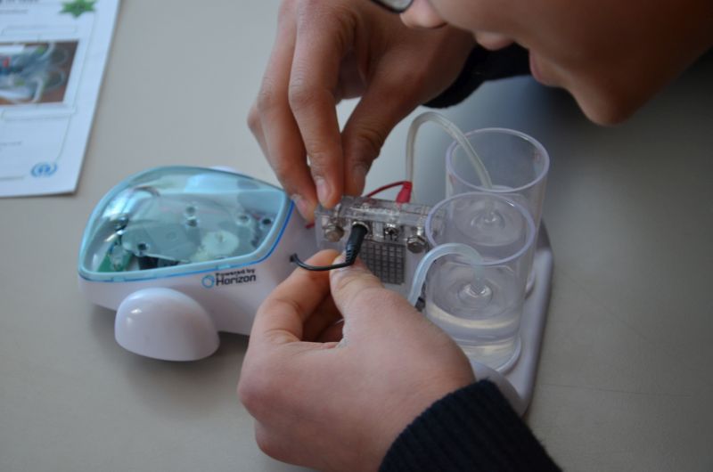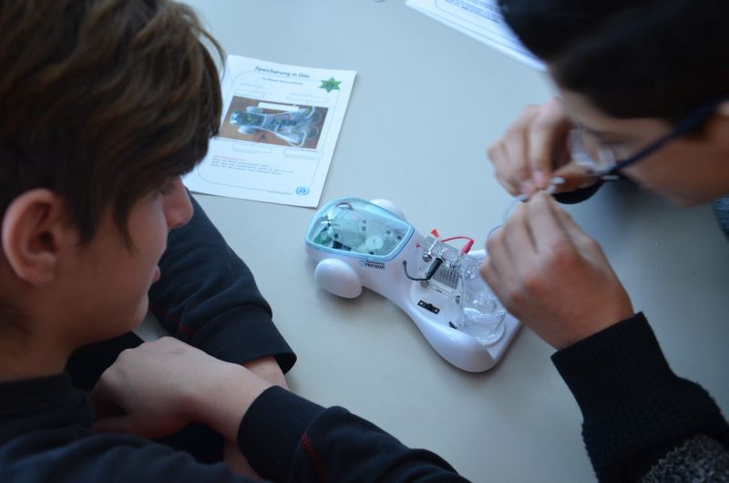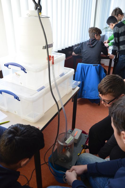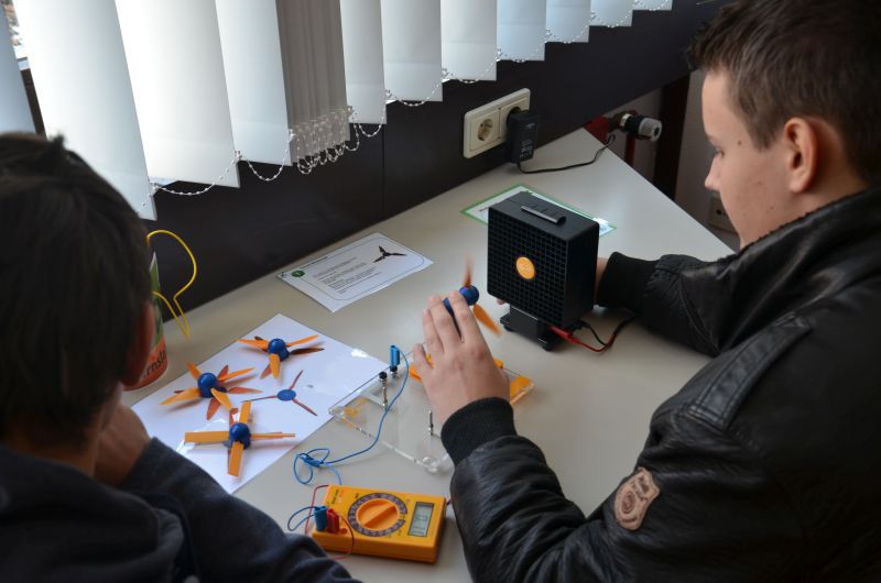 Eine Möglichkeiten zeigte bei dem anschließenden Rundgang durch die verschiedenden Stationen das Funktionsmodell eines Pumpspeicherkraftwerks. Doch auch die Batterien, bespielsweise eines Autos, können aufgeladen werden, wenn gerade viel Strom durch erneuerbare Energien erzeugt wird. Außerdem konnten die Schüler das Modell eines Brennstoffzellenautos fahren lassen, verschiedene Rotorblätter für Windkraftanlagen vergleichen und die Intensität und Schwankungen der Stromstärke von Strom aus Solar-, Windkraft und aus Batterien untersuchen.