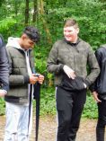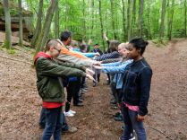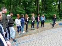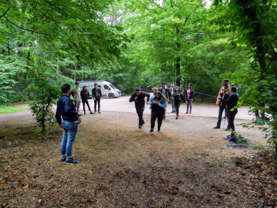 Dann haben wir die Regeln für den Tag kennengelernt und sind in den Wald gegangen. Wir blieben vor einer großen Sandsteinmauer stehen und spielten dort Spiele, bei denen wir zusammenarbeiten mussten. Zum Beispiel mussten wir einen Lavafluss überqueren, zusammen Bauklötze aufstapeln und einen Schatz aus einem Säuresee holen. Das war echt schwierig.