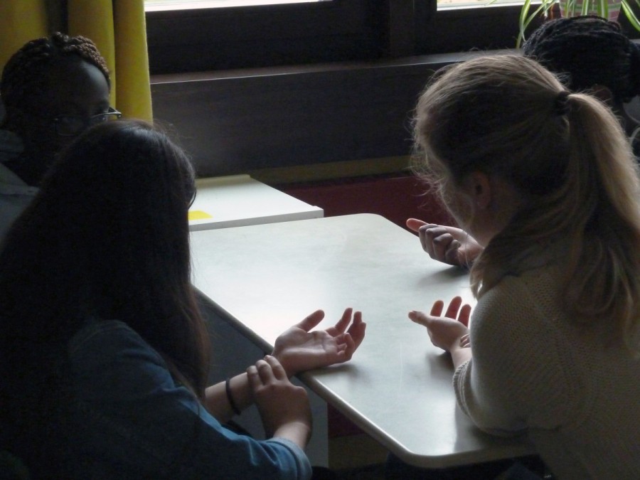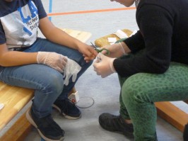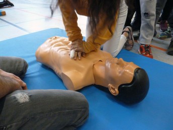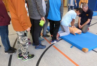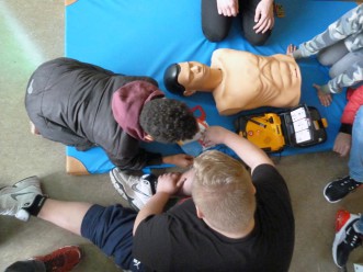 In einer anderen Gruppe redeten die Schüler über die Atmung. Wie oft atmen wir eigentlich in der Minute? Wie kann ich das überprüfen? Und wie reagiere ich bei Atemnot? Auch das Herz-Kreislauf-System wurde besprochen. Hier punkteten einige mit ihrem Wissen aus dem NuT-Unterricht. Das Messen des eigenen Pulses machte Spaß - besonders wenn man vorher durchs Treppenhaus rennen musste, um den Unterschied zwischen Ruhe und Belastung zu spüren. Beim Umgang mit einem Defibrillator-Dummy verloren die Schüler die Scheu, ein solches Gerät im Ernstfall einzusetzen und sind damit bestimmt dem einen oder anderen Erwachsenen einen Schritt voraus.