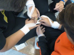 Schnell wurde klar: "Jeder kann und muss helfen!" So lernten sie beispielsweise, wie man einen Notruf absetzt und andere zum Helfen auffordert. Auch das Transportieren einer verletzten Person aus einer Gefahrensituation wurde geschult. Großen Spaß hatten alle beim Schneiden und Kleben von Pflastern und dem Anlegen eines Wundverbands. Aber auch das Handeln bei Nasenbluten und Brüchen wurde thematisiert.