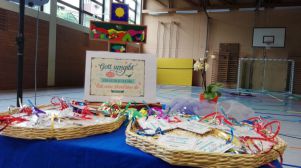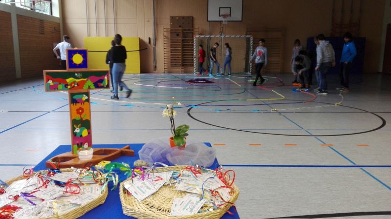 In der letzten Schulwoche trafen sich jeweils zwei Klassen in der Turnhalle, um gemeinsam eine kleine ökomenische Feier zu begehen. Im Mittelpunkt deren stand in diesem Jahr das Labyrinth, auf dessen einem Weg zur Mitte uns alle Gott begleitet. So gingen auch die Schüler den Weg durch das mit Seilen gelegte Labyrinth. Sie nahmen dabei an drei Stationen jeweils eine Feder, einen Luftballon mit einem Smilie oder einen Stein mit, um darüber nachzudenken, was ihnen im vergangenen Schuljahr leicht gefallen ist, was ihnen Spaß gemacht hat oder ihnen schwer gefallen ist.