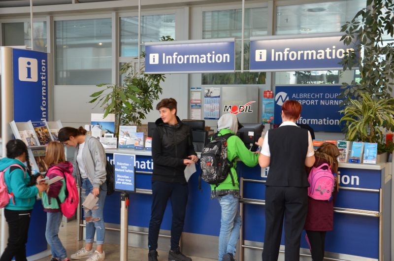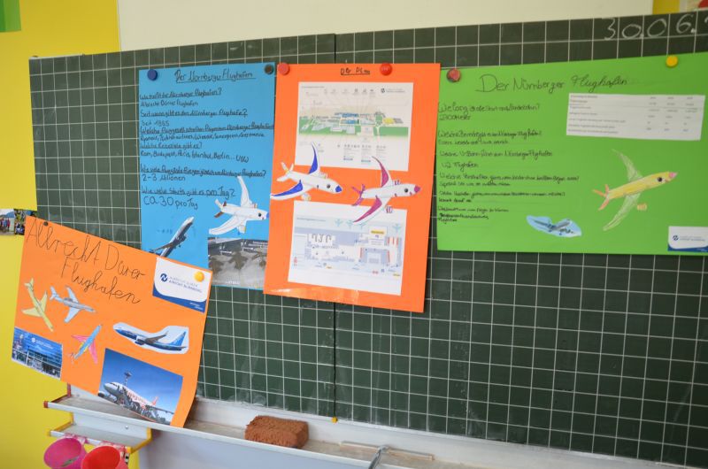 Heute haben wir mit der Klasse 1Aa von Frau Schmidt einen Ausflug zum Albrecht-Dürer-Flughafen in Nürnberg gemacht. Wir sind bis zur U-Bahnhaltestelle Frankenstraße gelaufen und anschließend mit der U1 und U2 zum Flughafen gefahren. Dort haben wir als erstes ein Quiz gemacht. Wir mussten mit den Kleinen Fragen für unseren Stand am Sommerfest beantworten.