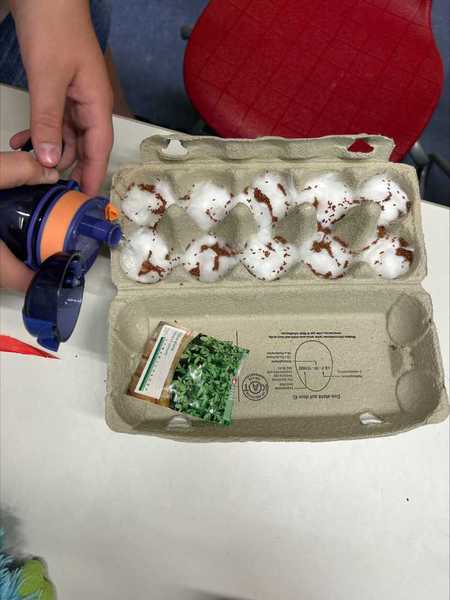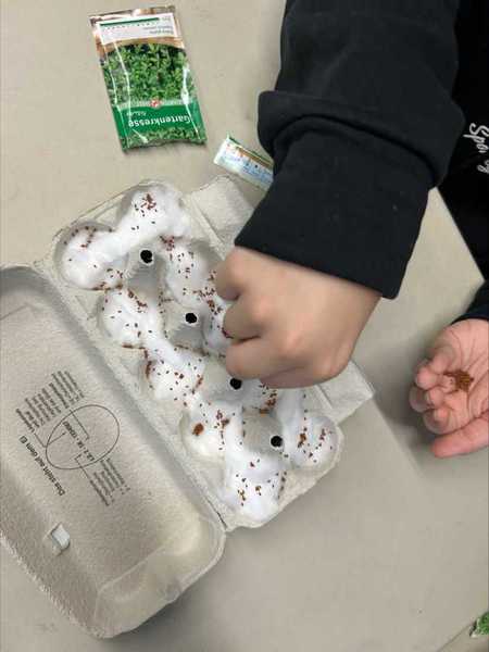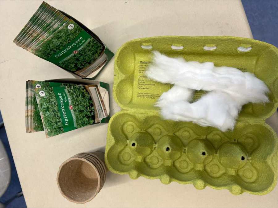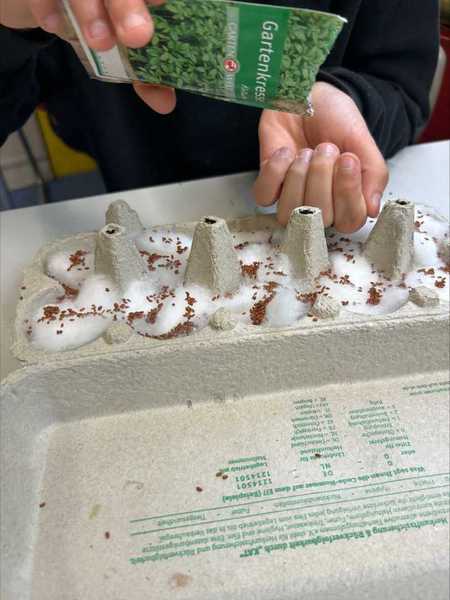 Am letzten Schultag haben wir Gartenkresse gepflanzt. Jedes Kind hatte seinen eigenen Eierkarton. Wir haben Watte hineingelegt und die Kressesamen darauf gestreut. Jetzt müssen wir nur noch regelmäßig gießen und warten, bis die Kresse wächst. Das hat viel Spaß gemacht und war ein schöner Abschluss für die 4. Klasse!
