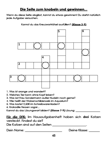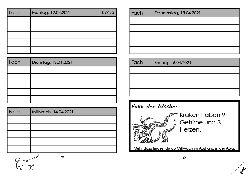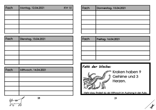 Unser Hausaufgabenheft beinhaltet nicht nur ein normales Kalendarium zum Notieren der Hausaufgaben. Man findet auch Regeln für unsere Schule oder Informationen über Preise für den Einkauf beim Hausmeister Herrn Bügler und in der Schülerfirma Schreibwaren.