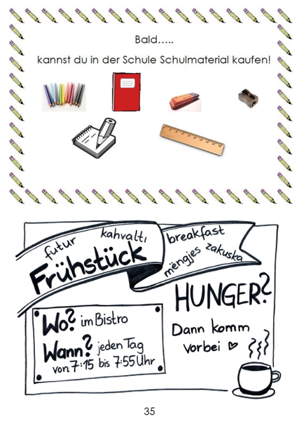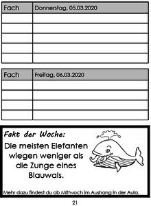 Jetzt gibt es schon das 3. Hausaufgabenheft, das extra von uns für unsere Schule gemacht wird. Natürlich ist ein normaler Wochenplan für die Hausaufgaben drin. Aber man findet auch witzige Informationen, wie zum Beispiel, dass ein Elefant nicht größer ist als die Zunge eines Wales. Außerdem gibt es noch Informationen über unsere Schule. Man kann sehen wie sich eine Biene in unserem Schulgarten entwickelt, wie unser Teich aufgebaut ist, dass es kostenloses Frühstück bei uns gibt, welche Schulmaterialien alle Schülerinnen und Schüler brauchen, Mitteilungen für die Eltern, Ferienplan und noch vieles mehr.