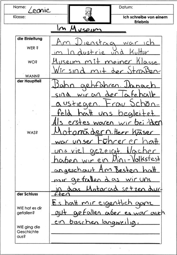 Gestern waren meine Klasse und ich im Museum. Wir sind um 9 Uhr losgegangen. Wir sind mit der Tramlinie 8 gefahren. Wir sind an der Tafelhalle ausgestiegen.