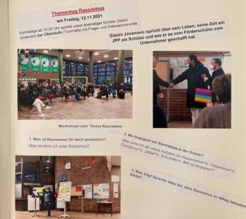 Ausgelöst durch einen Zeitungsartikel in der NN kam der Kontakt mit ihm wieder zustande. Er besuchte unsere Schule zunächst als Gast um daraufhin mit uns gemeinsam ein Thementag Rassismus zu gestalten. Vor den Schülern unserer Oberstufe sprach er über sein Leben, seine Zeit am JPP als Schüler und wie er es vom Förderschüler zum Unternehmer geschafft hat. Ein beeindruckender Weg und seine Erzählungen gingen Schülern wie Lehrern unter die Haut.