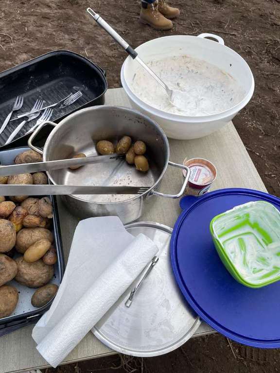 Anschließend befüllte sich jedes Kind ein Säckchen mit den frisch geernteten Kartoffeln, welches es mit nach Hause nehmen durfte. Frau Vogel schürte in der Zwischenzeit das Lagerfeuer an und wir durften heiße Kartoffeln mit Kräuterquark verspeisen. Das war super lecker!
