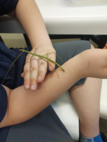 Wir haben unsere Angst überwunden und ließen verschiedene Heuschrecken über unsere Hände und Arme klettern.