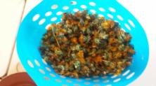 Am Tag 2 zupften die Schüler die goldgelben Blütenblätter ab und sammelten diese in einem Behälter. Die grünen Blätter werden aussortiert, da diese einen bitteren Geschmack im Gelee machen würden.