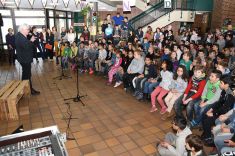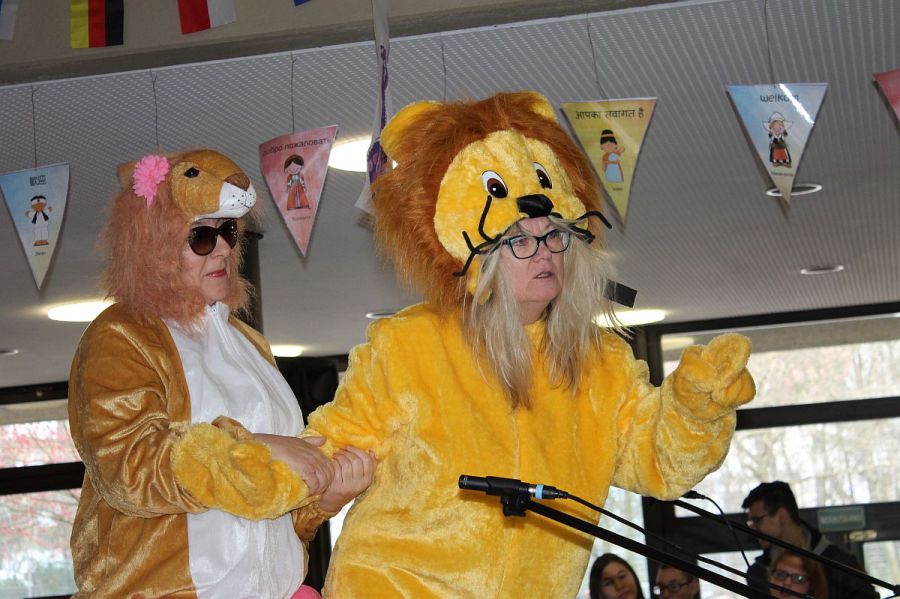 Zunächst trafen wir uns alle in der Pausenhalle, wo unsere Lehrer als Löwen, Gorilla und Huhn auftraten. Der Löwe, der nicht lesen konnte, war sehr traurig, weil er die Adresse der Löwin, in die er sich verliebt hatte nicht lesen konnte. So wurde er vom Gorilla mitgenommen zum Förderzentrum Jean-Paul-Platz um dort lesen zu lernen.