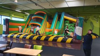 Der Indoorspielplatz bietet auf der Größe eines halben Fußballfelds verschiedene Rutschen, ein Bällebad, Indoor Klettern, Trampoline, eine Hüpfburg, elektrische Autos und eine Chill-out Area.