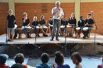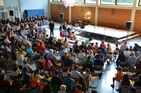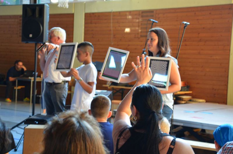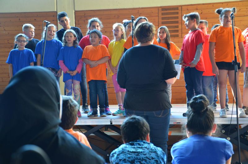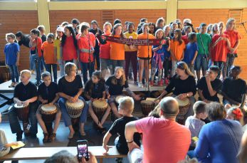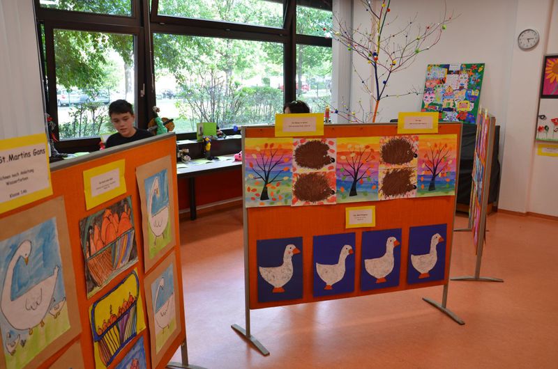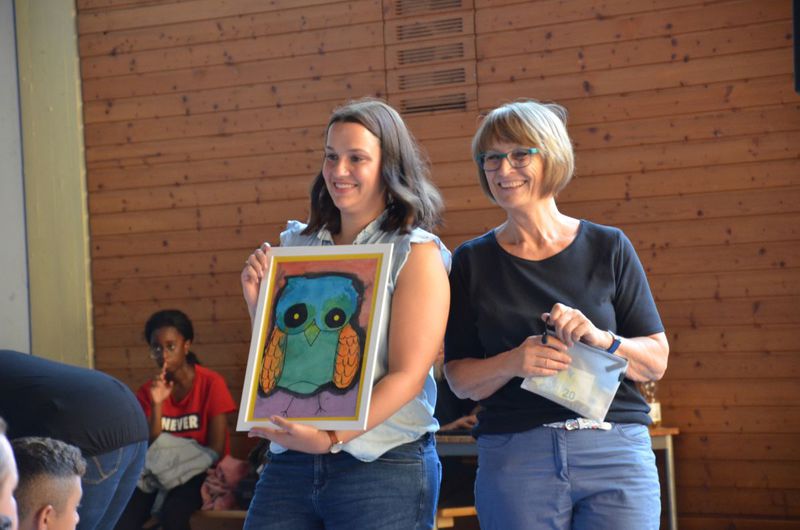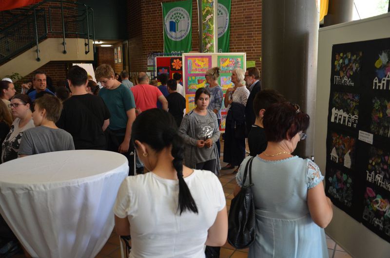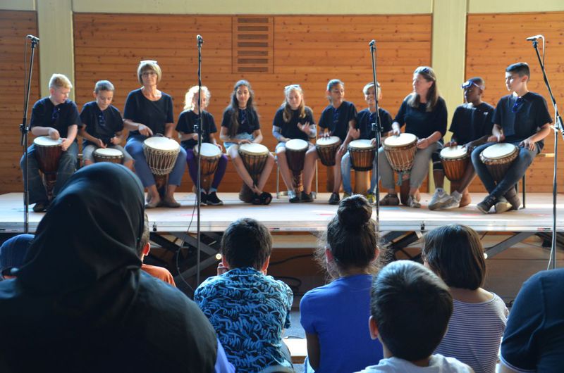 Im Anschluss warteten auf die Schüler, deren Eltern und die anderen Gäste die ersten Auftritte in der Sporthalle. So traten der DFK-Chor und der Unterstufenchor unter der Leitung von Frau Rösch auf. Auch die Trommelgruppe von Frau Salb begeisterte das Publikum. Danach gab es eine kurze Pause in der alle die Bilder und Plastiken der Schüler in den Ausstellungsräumen bewundern konnten. Die meisten sind im Unterricht von Frau Roy entstanden, die am Ende des Schuljahres leider die Schule in den verdienten Ruhestand verlässt!