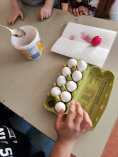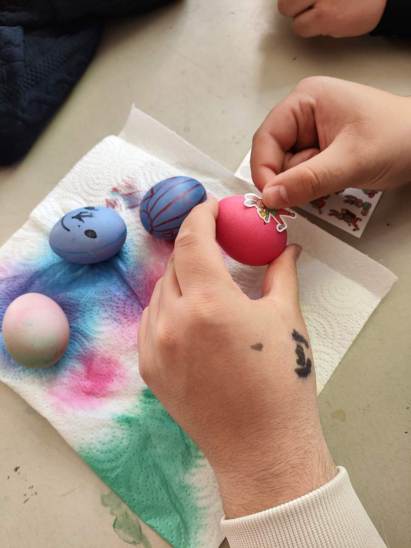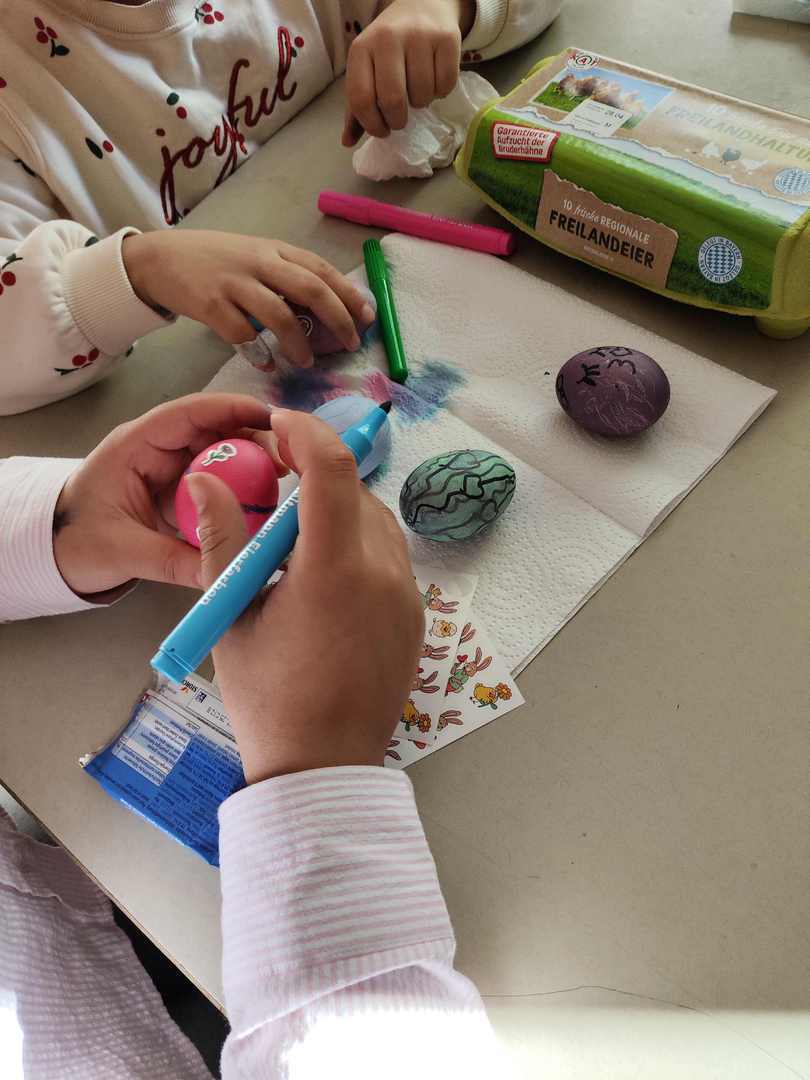Gemeinsam wurden gekochten Eier zunächst in die bunten Farbtöpfe getaucht. Dabei war der Kreativität keine Grenze gesetzt, sodass neue Farben durch mehrmaliges Eintauchen in verschiedene Farbtöpfe entstanden! Anschließend konnten die getrockneten bunten Eiern noch bemalt und mit Stickern verziert werden. Dabei unterstützen die Großen die Kleinen.