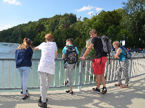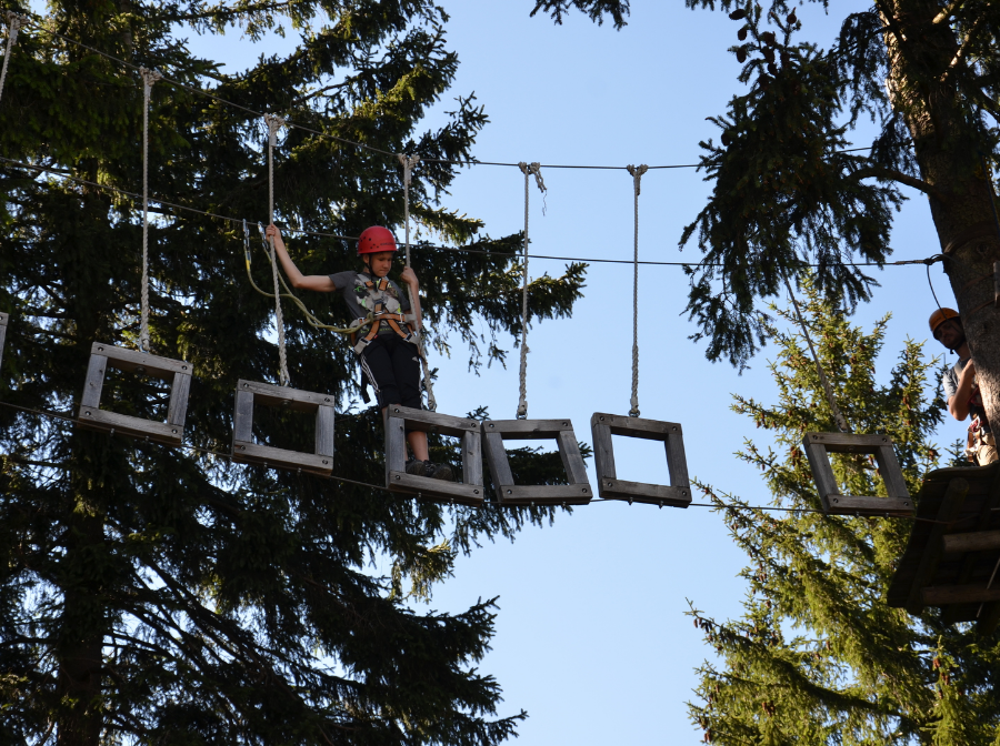 Mit einer Fahrt mit dem Sessellift zur Mittelstation des Blombergs begann der Mittwoch. Von dort ging es anschließend noch etwas mehr als eine Stunde zu Fuß auf den Gipfel des Berges. Das war schon echt anstrengend für einige Schüler. Nach einer Mittagspause mit den selbst zusammengestellten Lunchpaketen, wartete auf die Schüler aber eine Entschädigung ür die Anstrengungen. Es ging in den Kletterwald. Nach einer Sicherheitseinweisung - niemals durften zum Beispiel beide Karabinerhaken gleichzeitig aus dem Stahlseil ausgehakt werden - konnten die Schüler gemeinsam mit den Betreuern die Kurse abgehen. Einige trauten sich am Ende sogar den schwersten Parcours zu. Dieser verlief in 12 m Höhe und man musste mit einem Stahlseil gesichert, das einen langsam nach unten ließ, in das Nichts springen, um wieder unten anzukommen. Was für ein Finale. Runter vom Berg ging es zu Fuß und mit der Sommerrodelbahn.