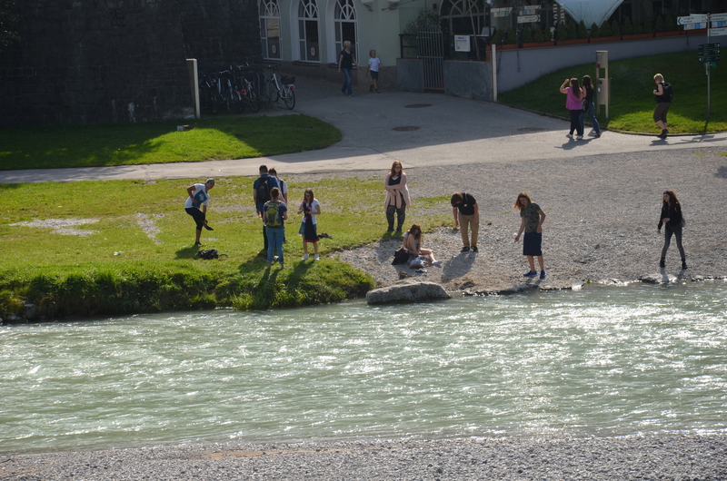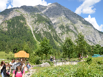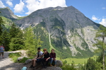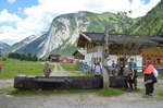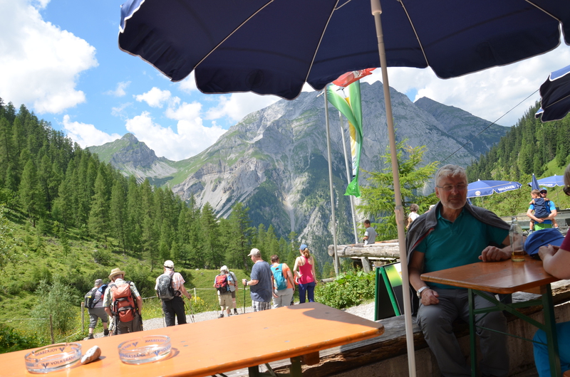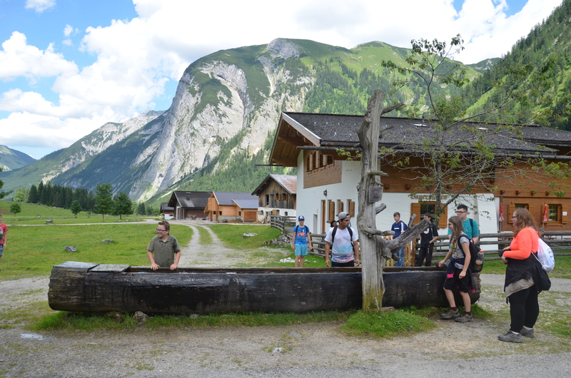 Am zweiten Tag stand ein Highlight der Fahrt an. Es ging noch einmal eineinhalb Stunden mit dem Bus in den Nationalpark Karwendel auf den großen Ahornboden in Österreich. Dort angekommen wartete auf die Schüler noch einmal eine zweistündige Wanderung auf eine Almhütte. Bei dem Ausblick auf bis zu 2700 m hohe Berge konnte man die Anstrengungen fast vergessen. Nach einer Brotzeit auf der Hütte ging es wieder hinunter. Durch einen Gebirgsbach und das größte Almdorf Europas - hier wird mit der Milch der Kühe ganz viel Bergkäse hergestellt - ging es zurück zur Bushaltestelle. Die Zeit des Wartens verbrachten einige Schüler noch mit Geocaching.