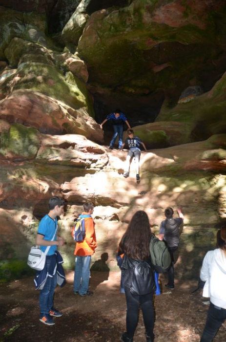 Als erstes sind wir mit der S-Bahn Richtung Neumarkt gefahren. Als wir in Schwarzenbruck ankamen haben wir dort einen Wasserspielplatz gesehen. Hier machten wir ein Klassenfoto. Danach sind wir zum Wald gelaufen. Als wir in den Wald reingingen haben wir einen coolen Steinfelsen gesehen. Auf diesen sind Ismail und ich hochgeklettert. Das war ziemlich schwer. Wir gingen weiter und sind an einer Brücke über die Schwarzach vorbei gelaufen. Im Wasser sahen wir kleine Fische. Dann sind wir in eine Sandsteinschlucht. Im alten Steinbruch war ein Gang mit einem riesigen Hohlraum am Ende, den wir gemeinsam betreten haben. Hier war es sehr cool, aber auch sehr unheimlich, weil man darin nichts gesehen hat und es eng war. Früher haben sie hier im Sommer Essen gekühlt. Als nächstes sind wir einen riesigen Berg hochgeklettert. Asrin, Oli, Ismail, Leon und ich sind fast nicht mehr herunter gekommen. Am Schluss bin ich heil unten angekommen. Die anderen sind ziemlich lustig heruntergerutscht, haha. Dann sind wir den ganzen Weg zurückgelaufen, aber halt ganz anderes. Wir sind dann vom Bahnhof Feucht mit der S-Bahn zum Hauptbahnhof Nürnberg gefahren sind dort alle wieder heil angekommen.
