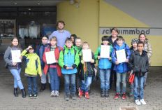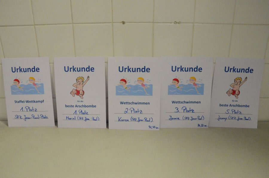 Am Ende des Vormittags war es aber nicht nur ein schöner, sondern auch ein sehr erfolgreicher. Dafür sorgten die anschließenden Wettbewerbe. Bei Staffelwettkampf der einzelnen Schulen gegeneinander, gewann das Team des SFZ Jean-Paul-Platz (Karen, Jenny, Jamie, Benjamin, Justin und Luca) souverän. Beim Wettschwimmen belegten Karen ganz knapp hinter der Siegerin den zweiten Platz und Jamie den dritten Platz. Der Abschluss war der Arschbombenwettbewerb, hier galt es die höchsten und weitesten Spritzer beim Springen in das Wasser zu erzeugen. Jenny belegte hier als einziges Mädchen im Finale den fünften Platz und Marcel wurder Sieger.