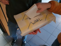 Nach kurzem Fußmarsch bei leichtem Graupel betraten die Kinder das Jugendzentrum in der Scharrerstraße und fühlten sich beinah wie bei der originalen Wahl. Die dortigen Mitarbeiter teilten die Wahlzettel aus, die Schüler stimmten geheim für ihre Entscheidung und warfen anschließend den Bescheid in die Wahlurne. Es war wirklich einfach!
