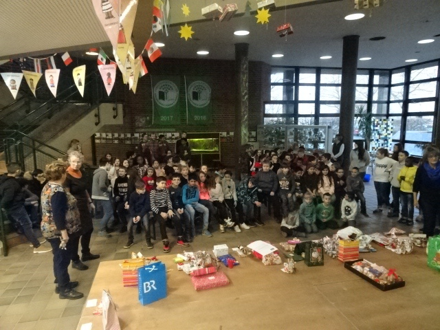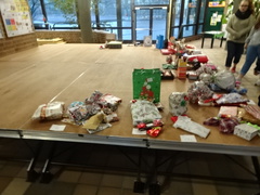 Am letzten Dienstag vor Weihnachten war es dann so weit: Die Schülersprecher und Klassensprecher haben alles vorbereitet und alle Geschenke in die Pausenhalle gebracht.