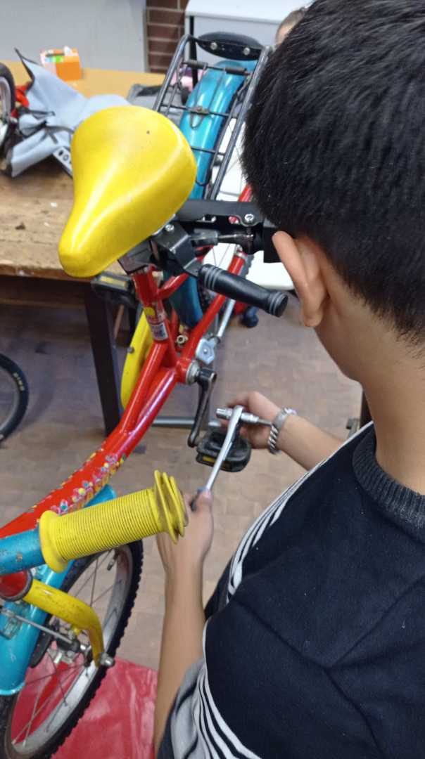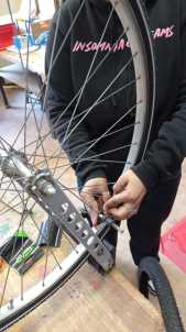 Im Rahmen des Projektes Meister an Schulen besuchte Herr Aumüller unsere Schule für zwei ganze Vormittage. Zunächst konnten die Schüler der Klasse 8a von Herrn Schmid, aufgeteilt in zwei Gruppen, für je eine Doppelstunde, den Beruf des Zweiradmechanikers kennen lernen. Am Anfang stand jeweils eine Kontrolle der Bauteile des Fahrrads. Funktionieren die Bremsen richtig, läuft die Schaltung flüssig, ist ausreichend Öl auf der Kette, Luft in den Schläuchen oder ein Achter in den Laufrädern. Anschließend beseitigten die Schüler mit Hilfe von Herrn Aumüller die Mängel. Bei fast allen Hinterrädern mussten die Jugendlichen die Schläuche austauschen. Dabei zeigte der Fachmann ihnen an aufgesägten Felgen deren Aufbau und gab Tipps, wie man am besten den Mantel vom Laufrad bekommt. Zum Abschluss konnten die Schüler die reparierten Laufräder auf verschiedene Arten wieder einbauen (mit dem Schraubschlüssel oder dem Schnellspanner, mit oder ohne Hollandschaltung) und aufpumpen.